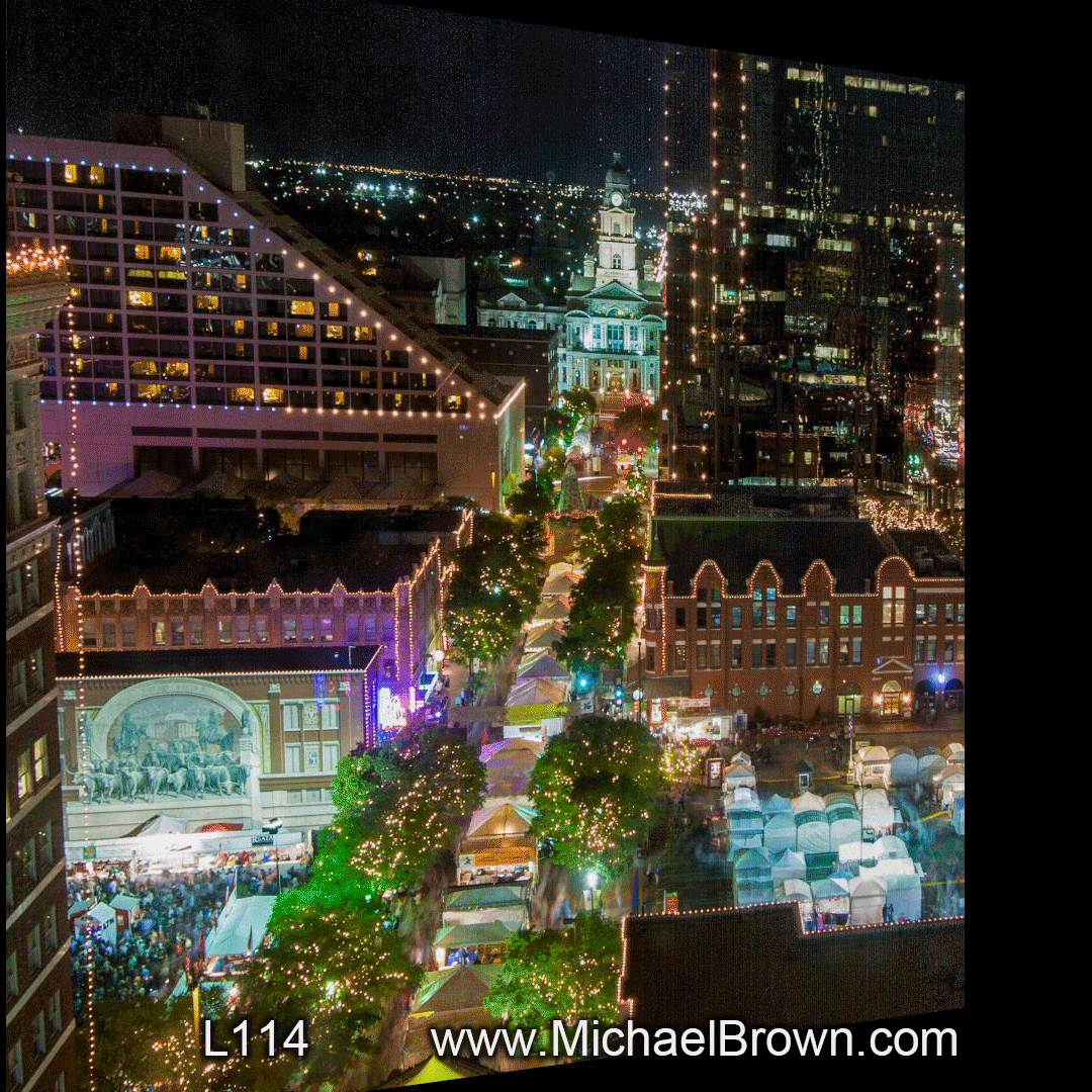 These photographs were taken right during the best time of year in Fort Worth—the art festival. The tents line Main Street and you can see Sundance Square right down to the courthouse. The buildings glitter and are lit at night creating a stunning nighttime scene.